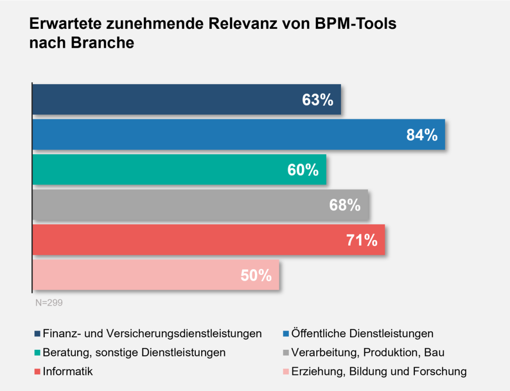 Besonders spannend ist die Entwicklung in der eigenen Branche. In der ICT erwarten 71% der Unternehmen einen Bedeutungszuwachs von BPM-Tools. Damit liegt die ICT-Branche hinter dem öffentlichen Sektor auf Platz zwei und bestätigt die zentrale Rolle von BPM-Software als technische Grundlage für End-to-End-Automatisierung, Process Mining oder KI-Assistenz.